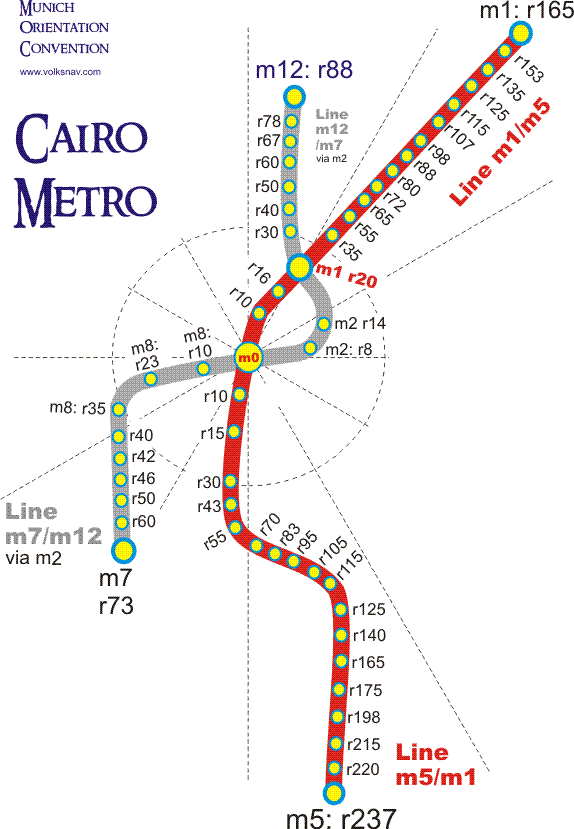 Cairo metro with logical station codes, compatible to www.volksnav.com/cairo . For better overview, station names are omitted