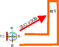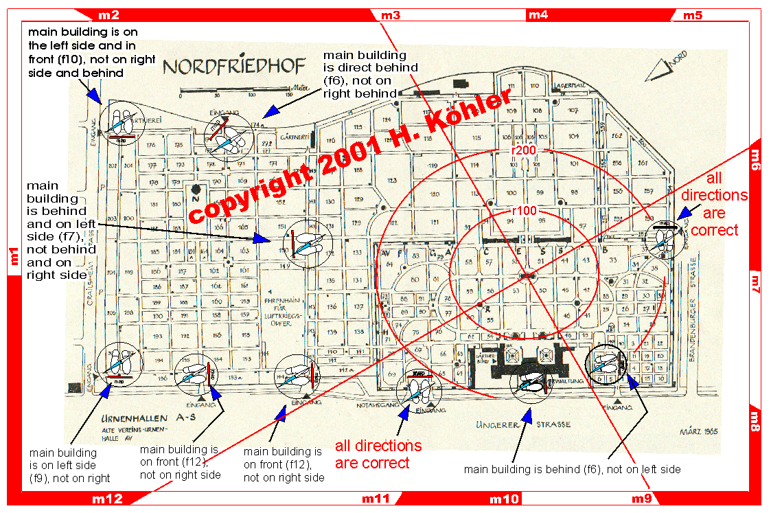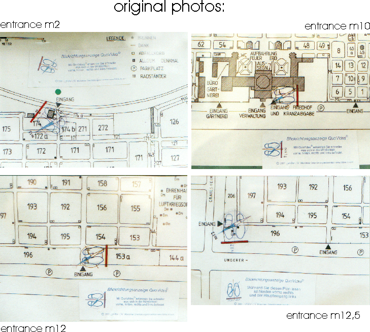 B - Orientierung ohne Transfer . B1 - Peilung mit 4 Grundrichtungen Suchen Sie immer zuerst nach dem QuoVides® und fragen Sie sich beispielsweise: "wenn ich die Flucht nach vorne ergreife, wohin würde ich - im Plan - laufen?". Dann wissen Sie auch blitzschnell was sich in der Wirklichkeit hinten, rechts und links befindet. Bilden Sie im Plan einfach einen Winkel zwischen quo vadis und eine dieser 4 Richtungen, dann schauen Sie nach unten auf Ihre Füße und rekonstruieren Sie diesen Winkel. NOCH BESSER: . B2 - Peilung mit imaginären Uhren Lesen Sie einfach Ihr quo vadis mit der F- oder mit der M-Uhr ab! . B2.1 Frontal-Uhr = frontal clock: Wenn vorne f12 ist, dann befindet sich der vorher gesuchte Sektor m1 sowohl im Plan wie auch in Wirklichkeit von Ihnen aus gesehen in Richtung f5. Schauen Sie dann auf Ihre Füße in der Wirklichkeit und gehen Sie beruhigt in diese Richtung f5. Falls der direkte Weg versperrt sein sollte, werden Sie automatisch und natürlich das Richtige machen. Wenn Sie über f6 gehen, sind Sie "zu spät" und werden bei der nächsten Gelegenheit den Fehler "nach früher" korrigieren. Achtung: wenn Sie die Richtung Ihres Körpers ändern, ändert sich auch die Peilung mit der Frontal-Uhr. Für längere Strecken empfiehlt sich: . B2.2 M-Uhr = Munich clock: Wenn Norden m12 ist, dann befindet sich quo vadis von Ihnen aus gesehen in Richtung m2, also 2 "Stunden später" als m12. Wo liegt aber m12? An der Kompaßnadel vom QuoVides® erkennen Sie es: m12 liegt 3 "Stunden später" als Ihre Blickrichtung. Die Dienstleistungs-Quantensprünge: - die Blickrichtung im Plan - die neue Orientierungs-Kultu(h)r Wie Sie sehen, QuoVides® macht Sie schlauer und freier. Imaginäre Uhren benutzen Militärs, Piloten, Blinde, ja sogar 7-jährige Pfadfinder schon seit 100 Jahren und das aus gutem Grund. Wieso kam niemand früher auf die Idee, die Bevölkerung über diese hilfreiche Zeit / Raum-Konvention aufzuklären? . Mit QuoVides® können endlich falsch aufgestellte Pläne in U-Bahn, S-Bahn, Wartehäuser, Tierparks, Olympiapark, Englischer Garten, Frauenklinik, Gasteig, etc. ja sogar Rettungs- und Fluchtpläne "entfälscht" werden. . Andererseits, falls der Plan korrekt aufgestellt ist, erkennen Sie dies am QuoVides® schlagartig: "Ihre" Füße zeigen dann nach oben und in diesem Fall ist QuoVides® ein Gütesiegel bzw. Zertifikat. . Die im Nordfriedhof Münchens aufgestellte Konstellation soll helfen klarzustellen, daß, obwohl dort die Pläne nicht "eingenordet" sind, man sie trotzdem korrekt - aber auch äußerst irreführend - aufstellen kann. So gesehen, läßt sich scherzhaft sagen: QuoVides® ist meistens ein Lügendetektor. Folgende Animation stellt eine was-wenn-Betrachtung über die Anbringung des Aufklebers dar: Zum Schluss wird das realisierte Beispiel Nordfriedhof gezeigt: