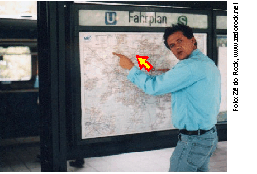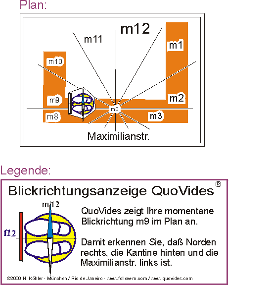 Der Plan ist also irreführend aufgestellt. Einfach ausgedrückt: ohne QuoVides® lügt er. Wie kommt es dazu?Problemstellung: Heute enthalten senkrecht aufgestellten Pläne bestenfalls nur einen StandPUNKT, aber lassen keine StandRICHTUNG erkennen. Der Benutzer einer Planes will aber nicht nur wissen, wo er sich befindet, sondern Zielrichtungen ermitteln und sich diese als Geh- oder Fahrtrichtungen in der Wirklichkeit merken. Diese zu merkenden Richtungen sind eigentlich Winkel, die jeweils von einem selbst ausgehen und sich auf die momentane Geh- oder Fahrtrichtung beziehen. Man spricht von einer Winkelorientierung oder Anpeilung. Beispielsweise ist "rechts" nichts anderes als ein 90-Grad-Winkel zu der Fahrt-, Geh- oder Blickrichtung. Zur Bildung eines Winkels benötigt man also unbedingt eine Bezugsrichtung die im Plan und in der Wirklichkeit identisch ist. Aber wie läßt sich heute diese Bezugsrichtung im Plan schnell und eindeutig ermitteln? Ohne QuoVides® geht das nur mit viel Detektivarbeit. Andererseits, wenn im Plan die momentane Blickrichtung nicht erkennbar ist, wird oft - manchmal nur im Unterbewußtsein - die Nordrichtung als allgemeingültige Bezugsrichtung genommen, auch weil sie oft die "Karte oben"-Richtung ist. Aber wo ist Norden? . Das Märchen von der Einnordung Man behauptet zwar, senkrecht stehende Pläne sind eingenordet (stimmt nicht immer), aber auch das ist eine Irreführung: der Nordpfeil zeigt dann zum Himmel, aber Norden ist nicht im Himmel, sondern am Horizont. Die angebliche Himmelsrichtungsanzeige ist dann in Wirklichkeit eine R i c h t u n g - H i m m e l s - a n z e i g e. Überzeugen Sie sich selbst: Bei einem senkrecht stehenden Plan - wie auch jetzt bei Ihnen am Monitor - zeigt der Südpfeil der Windrose nicht nach Süden sondern zum Erdmittelpunkt, der Ostpfeil besagt, Osten ist rechts und der Westpfeil besagt, Westen ist links, EGAL WIE DER PLAN - und Ihr Monitor - IM RAUM AUFGESTELLT IST. Ist das nicht absurd? Ein Plan sollte die Wirklichkeit abbilden. Die abgebildete Wirklichkeit der senkrecht aufgestellten Plänen ist jedoch HORIZONTAL (!) Nachdem "Plan oben" nicht "Wirklichkeit oben" sein kann, zwingt man den Benutzer zumindest zu einem imaginären Transfer des Planes in die Horizontale Durch die gedankenlose Aufstellung zwingt man ihn meistens - damit die Himmelsrichtungen dann übereinstimmen - zu einer zusätzlichen imaginären Drehung um eine vertikale Achse. Über die Richtung und Größe dieser Drehung gibt man jedoch mangels Ideen bisher keine Auskunft. Bei einem Fluchtplan, z. B. im Kaufhaus, könnte sich dieses "Kavaliersdelikt" für Sie fatal auswirken: der Plan suggeriert, die Fluchttür, der Feuerlöscher etc. seien beispielsweise links, in Wirklichkeit können sich diese Ziele aber vorne, hinten oder gar rechts befinden. Falsche Freunde: die vermeintliche Orientierungshilfe bewirkt oft eher eine OrientierungsBERAUBUNG. Dieselbe vorsätzliche Vortäuschung falscher Tatsachen in der U-Bahn, in Wartehäuschen etc. bewirkt, daß Sie womöglich in die falsche Richtung einsteigen. Wenn Sie nach Erkennung des Fehlers zurück fahren, werden Sie beispielsweise in München zum Schwarzfahrer, wenn Sie dann nicht nochmals bezahlen . Beispiel: bitte Photo anklicken. Noch schlimmer: wegen dieses Systemfehlers meinen im Laufe der Jahre viele Menschen, sie selbst sind UNFÄHIG, Straßenkarten lesen zu können und benutzen deswegen - zum Nachteil der Straßenverkehrssicherheit - dieses wichtige Mittel zur Reisevorbereitung kaum oder erst gar nicht. . Erproben Sie selbst: sehen Sie sich einen beliebigen Plan in der U-Bahn, im Wartehäuschen, einen Fluchtplan etc. genauer an. Merken Sie sich ein Ziel in der Nähe des rechten Randes und versuchen Sie zu ermitteln, ob dieses Ziel auch in der Wirklichkeit rechts liegt. Wenn ja, purer Zufall. In diesem Fall überlegen Sie bitte, ob es nicht irreführend wäre, wenn der selbe Plan an den anderen Wänden aufgestellt wäre. . Eigentlich müßte an den meisten Plänen folgende Erläuterung dabei stehen: "Achtung, dieser Plan wurde unlogisch aufgestellt. Falls Sie eine echte Richtung benötigen, versuchen Sie Ihr Glück anders wo, nur nicht bei uns" Aber die Anderen sind auch nicht besser, denn niemand wurde bisher animiert, etwas gegen diese Volksverdummung zu erfinden. Oder doch? Natürlich! . Lösung: Nun ist das anders: zur Findung Ihres quo vadis in der Wirklichkeit haben Sie mit QuoVides® folgende elegante Möglichkeiten: