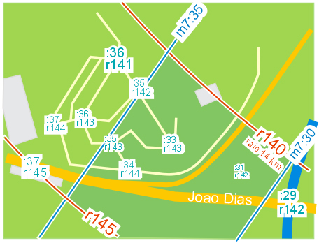 A cidade práticamente se divide como um bolo em 12 setores, ou seja, ao redor da Praça da Sé, chamada de centro ou pólo m0, o horizonte se divide em 12 "horas-horizonte" denominadas m1 a m12. m12 aponta pro norte e Monte Azul fica no setor m7 |
