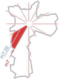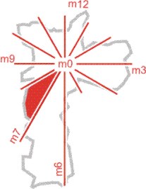 Esses setores são divididos em minutos-horizonte, o que é a distância até a hora-horizonte em "passos" de aprox. 100 metros. Exemplo: m7:36 ( leia "eme 7 ponto 36" ou "eme sete 36" ). Esse código descreve uma linha imaginaria (ao lado em azul) que se encontra numa distância de 36 x 100m da direção m7. A convenção dos minutos-horizonte é bem simples quanto maior, mais "tarde" fica.